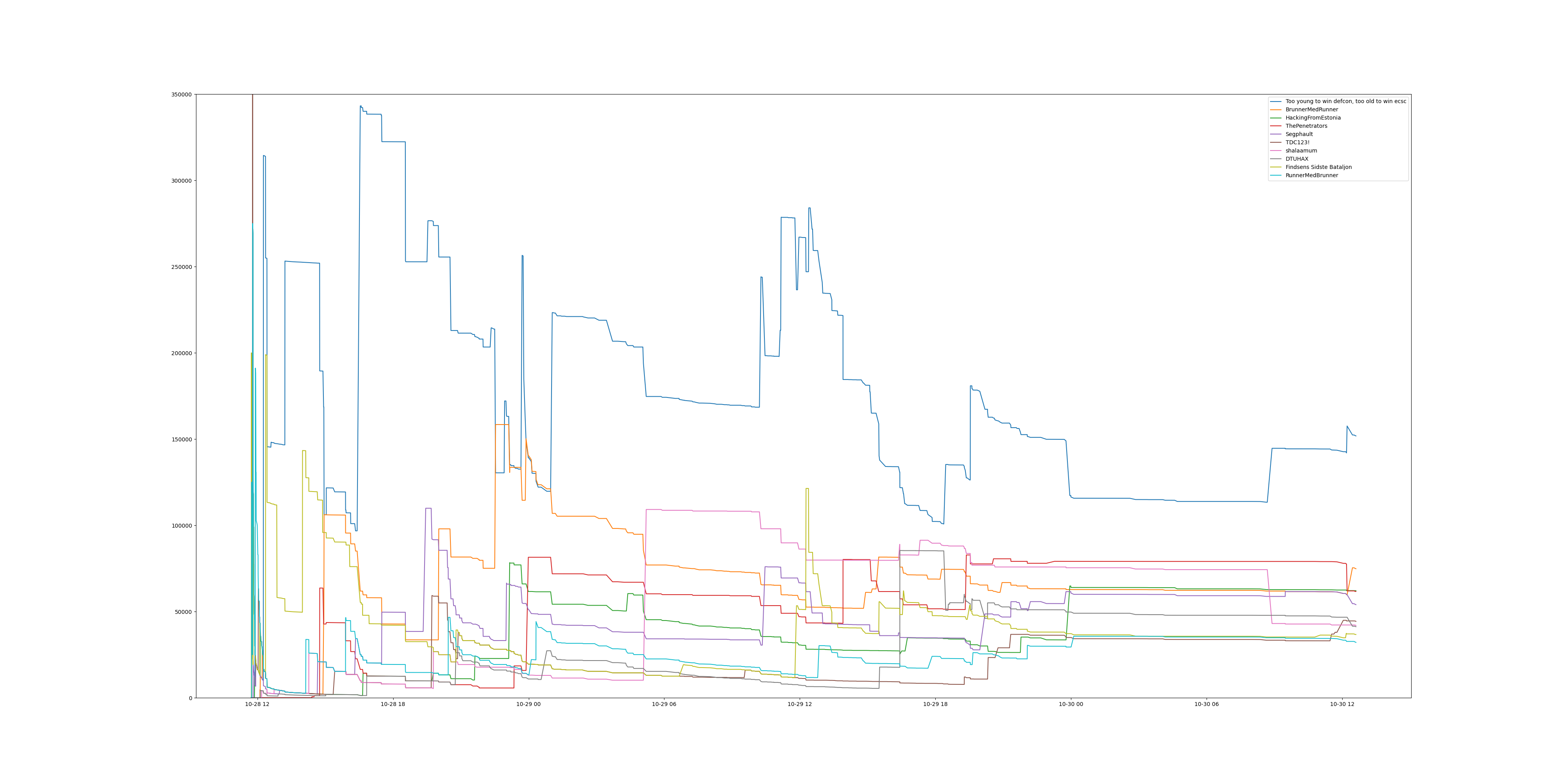 And finally, this is what the scoreboard would have been if we had used CTFd dynamic scoring with parameters max_value=500, min_value=100, decay=20 (except groups of challenges, where max_value and min_value have been scaled accordingly):
